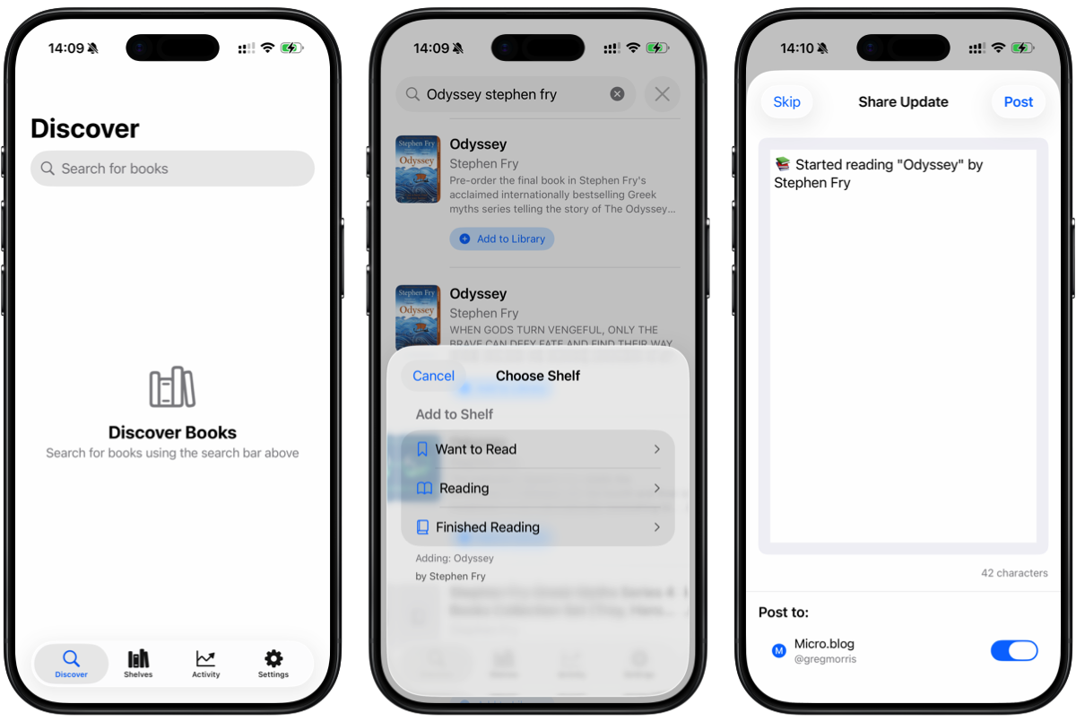 The main parts of the app are already built and working well. You can search for new books, add them to your shelves, and even post about them to Mastodon, Micro.blog or Blue Sky.